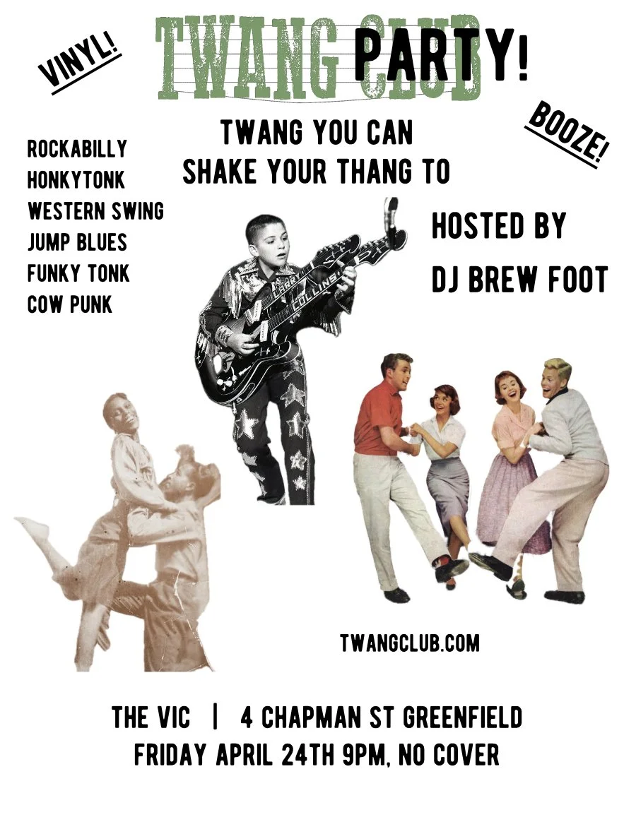 In other news Twang Club is making it’s debut at the Victoria Bar in Greenfield, affectionately known as The Vic on Friday April 24th at 9pm. If you haven’t been there in awhile Phil, Angel, and Sam Simon purchased it awhile back and have done great things with it. I’ll be focusing on fun, danceable music so come ready to party!